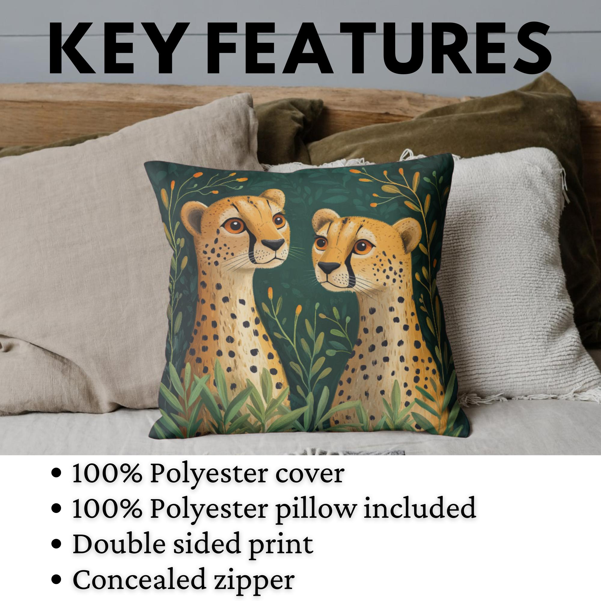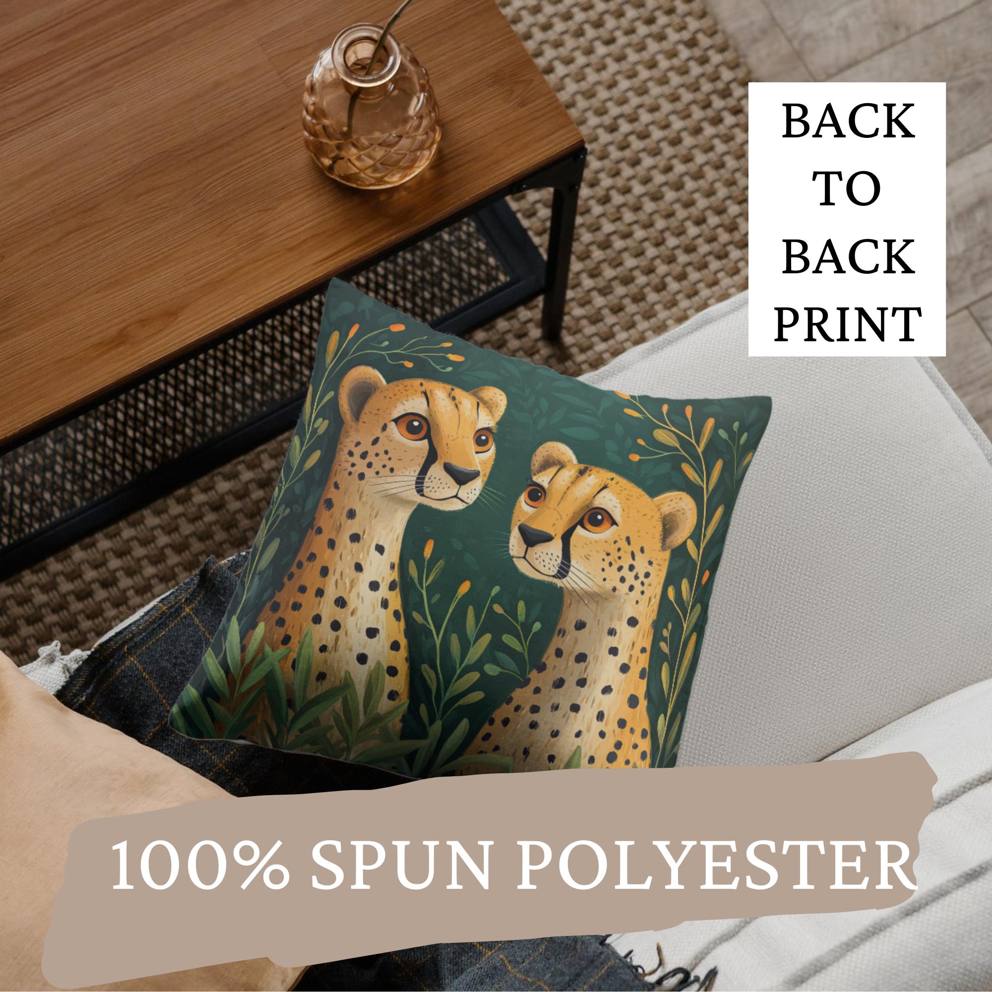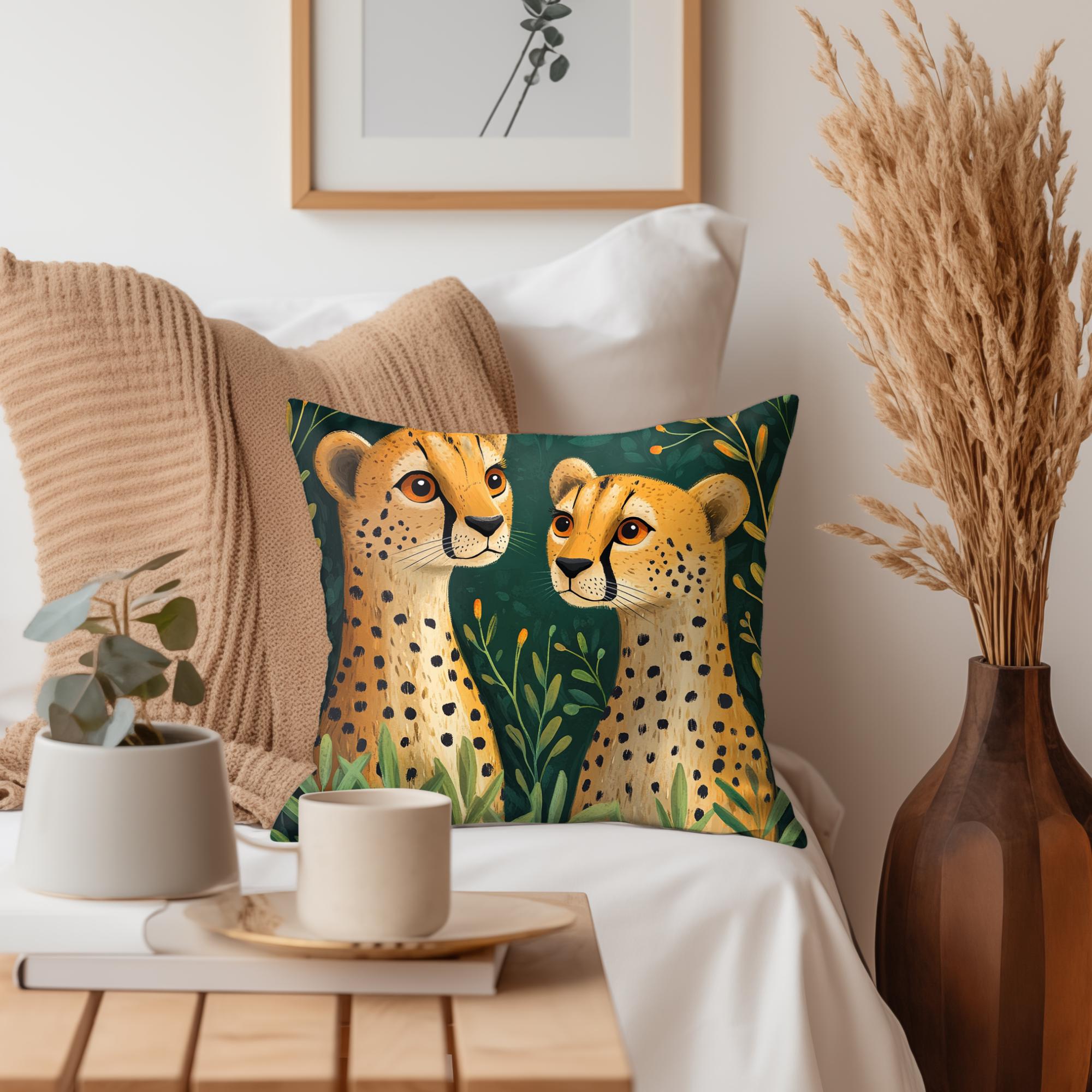 This charming pillow features a pair of wide-eyed cheetahs surrounded by leafy greenery, creating a scene that feels both playful and gently adventurous. The rich green background makes the warm golden tones of the animals stand out beautifully, while the hand-painted style adds a cozy artistic touch.
