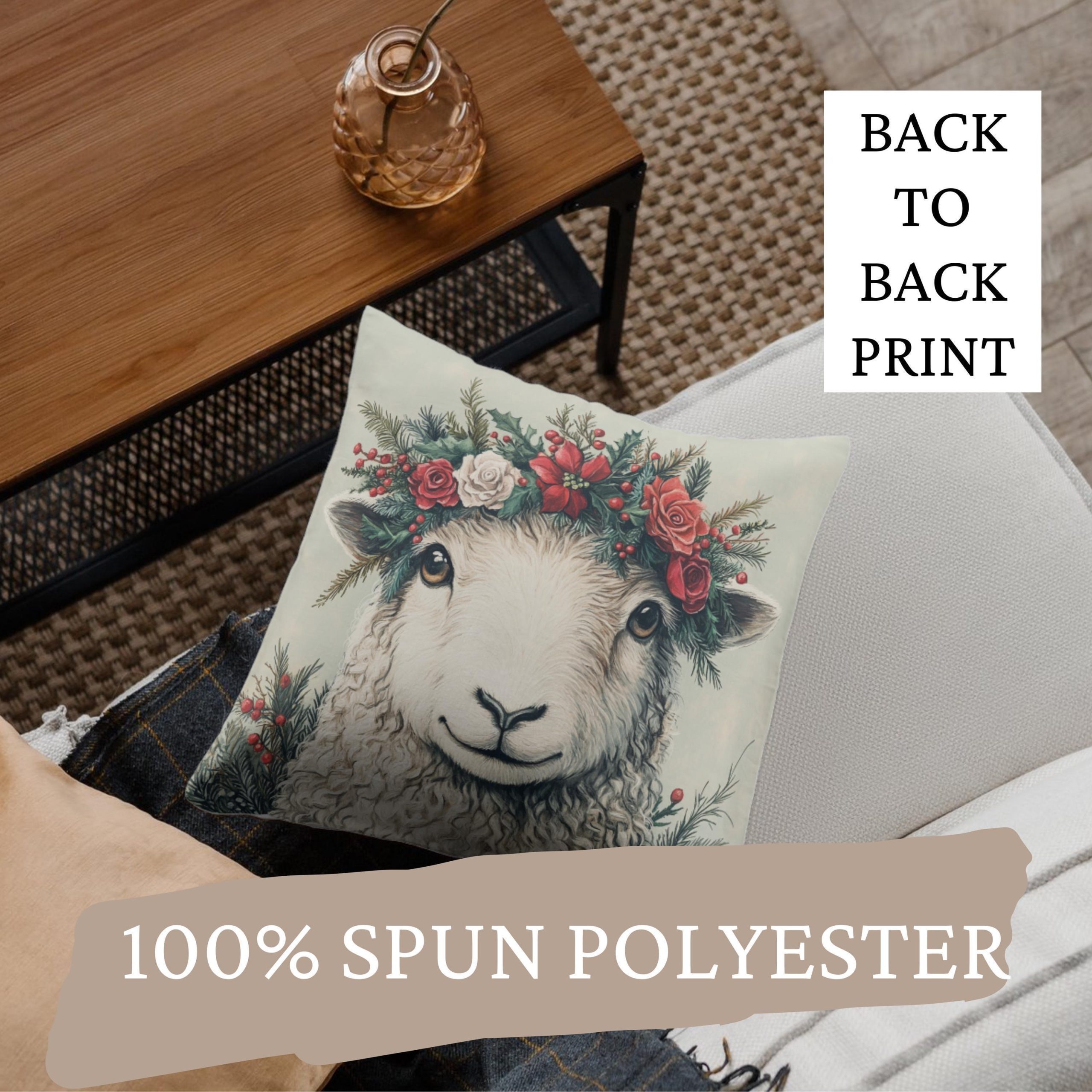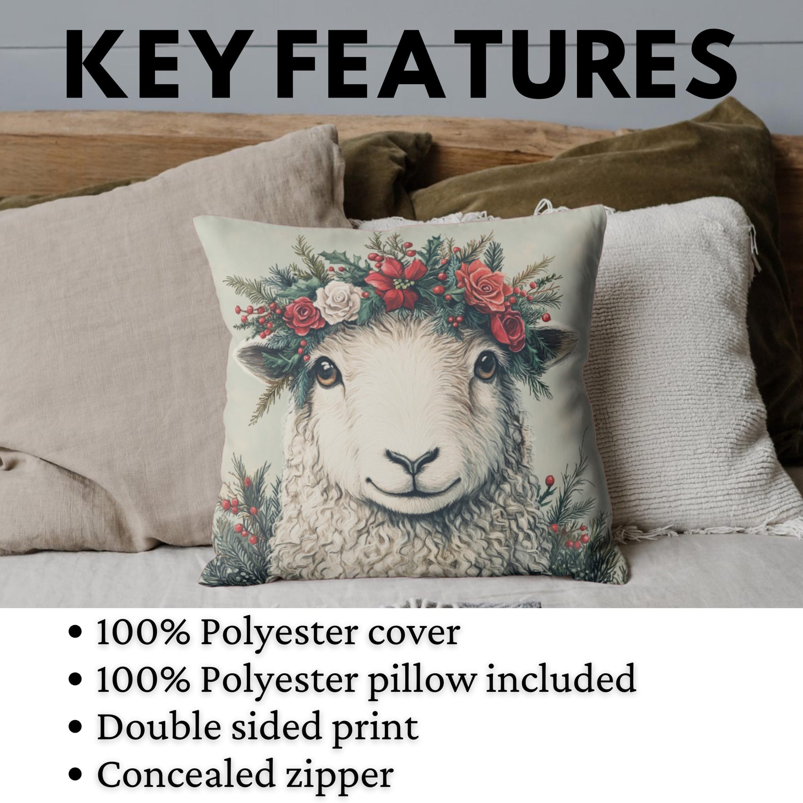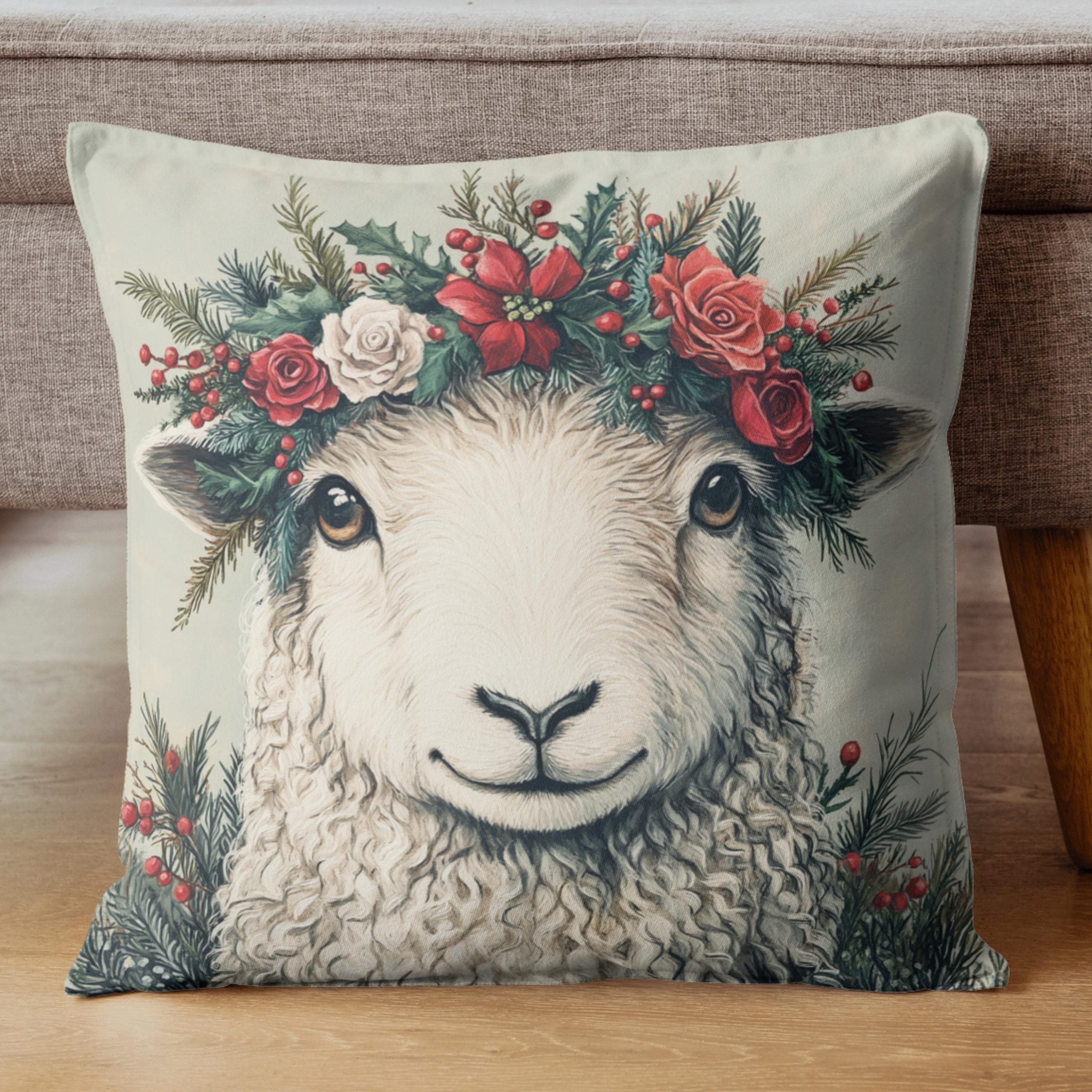 This charming pillow features a gentle sheep framed by a festive crown of red and white blooms, evergreen sprigs, and winter berries. The artwork blends cozy farmhouse warmth with holiday floral beauty, creating a look that feels sweet, seasonal, and full of storybook charm.