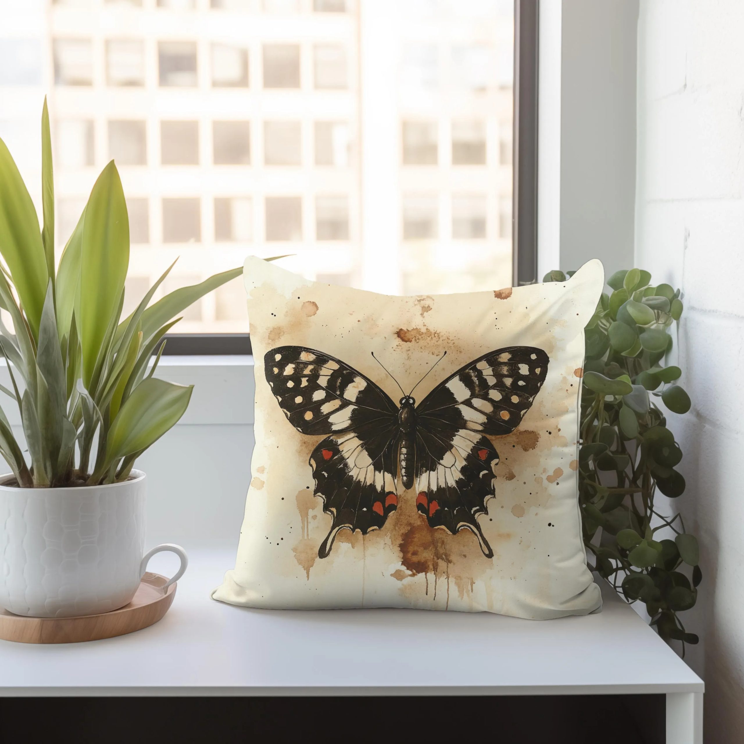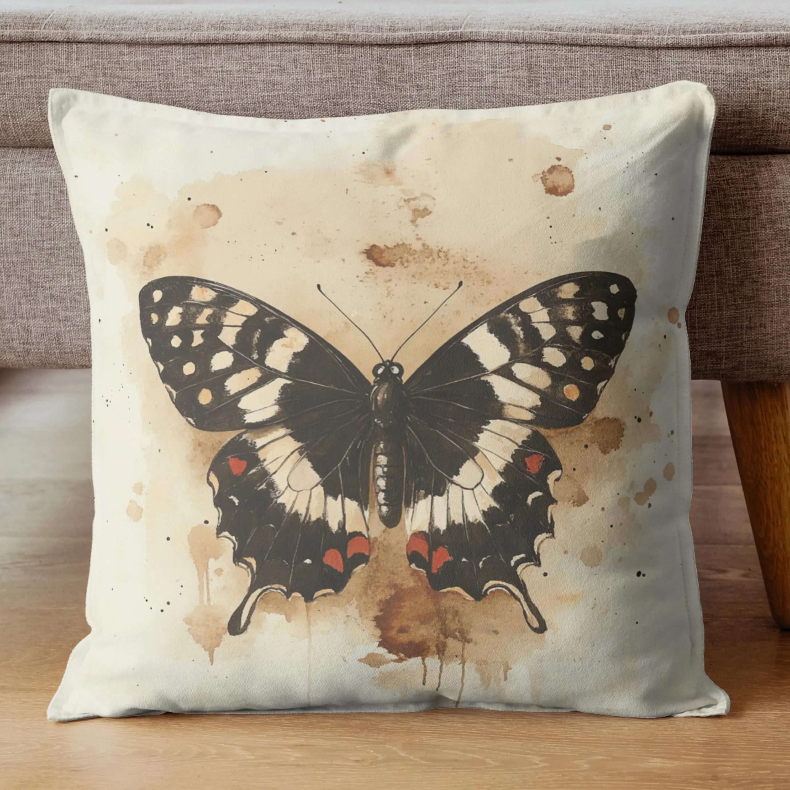This pillow showcases a striking black butterfly set against a soft ivory background with subtle watercolor-style splashes, creating a look that feels both delicate and dramatic. The centered composition gives it a clean, gallery-inspired presence, while the butterfly’s intricate wing details add timeless natural beauty.