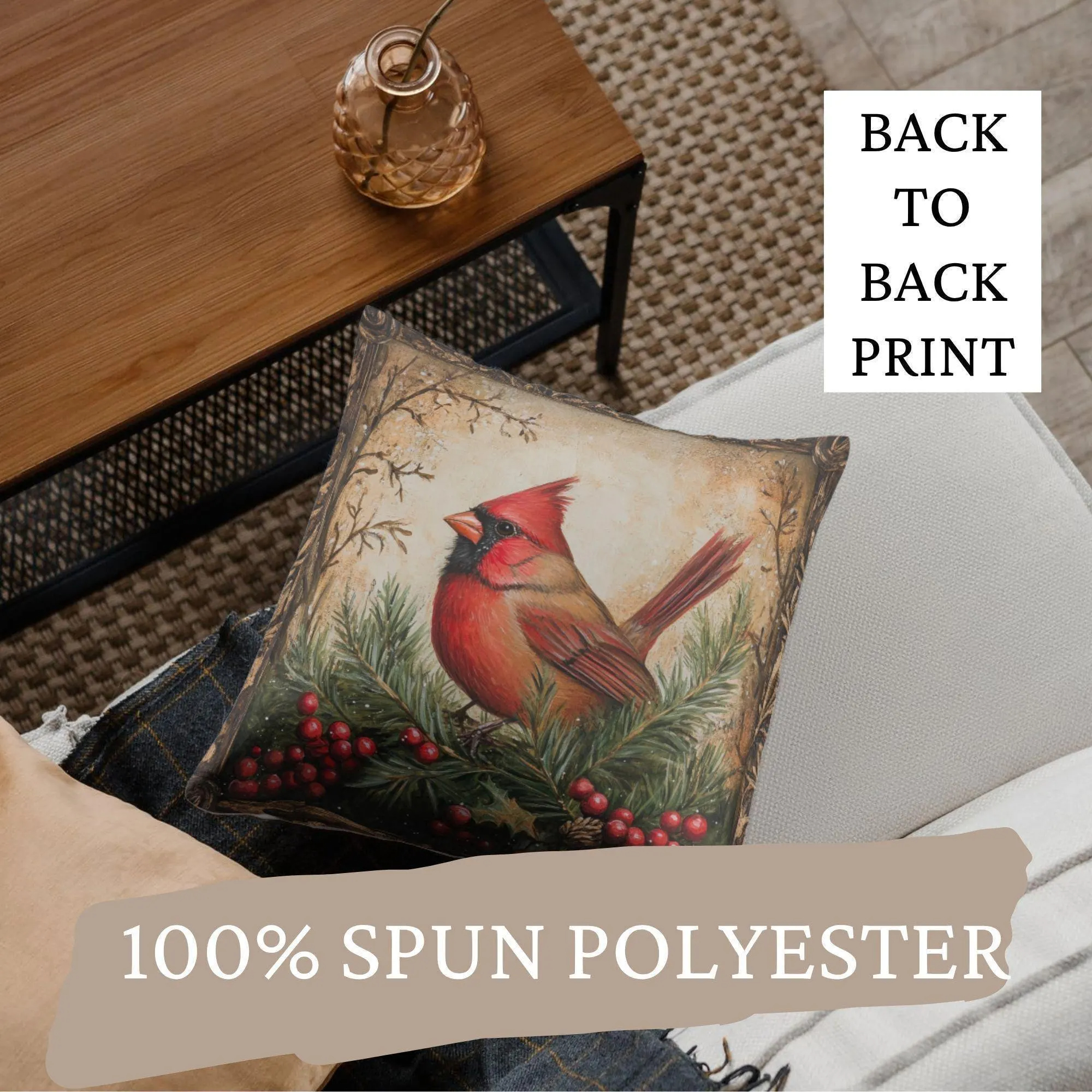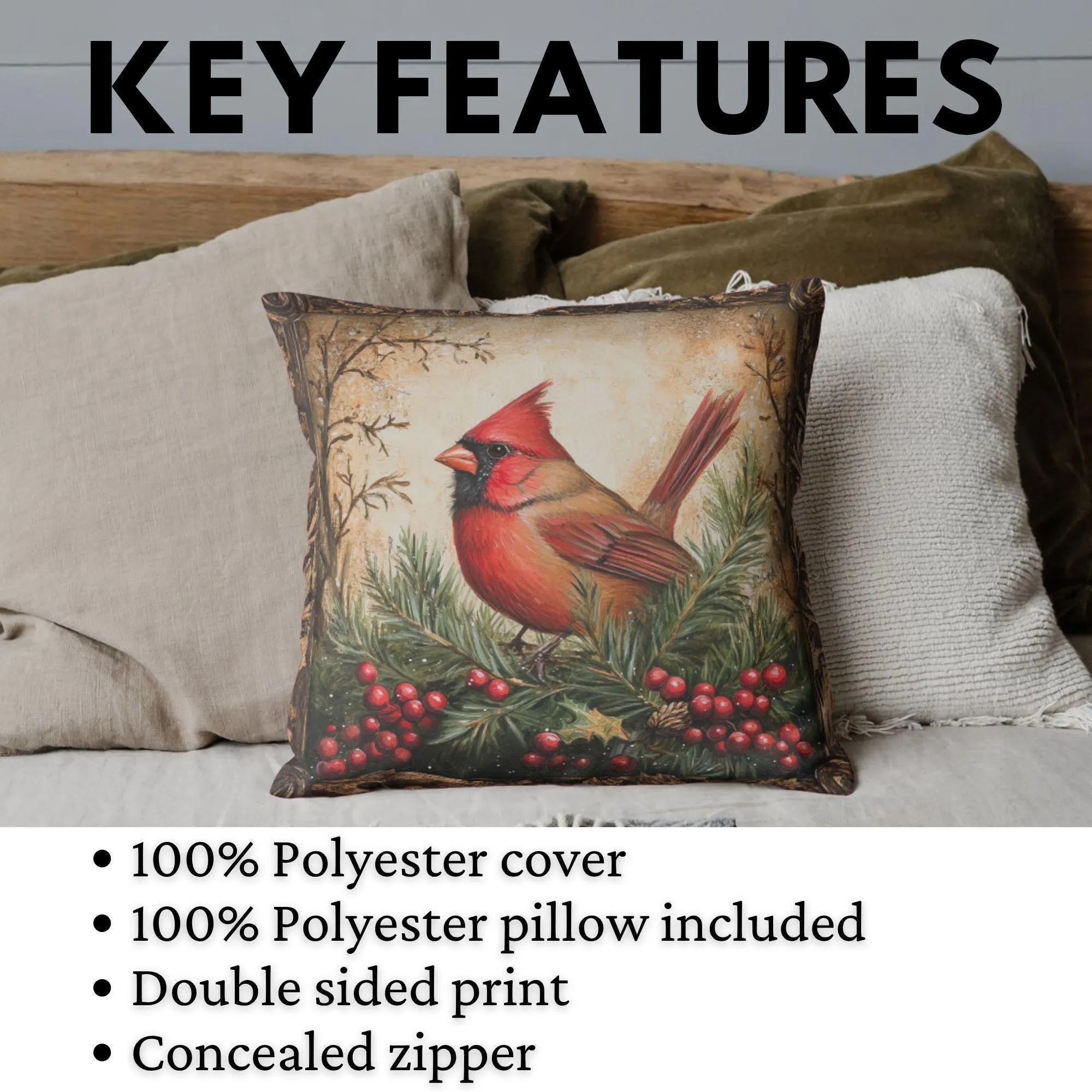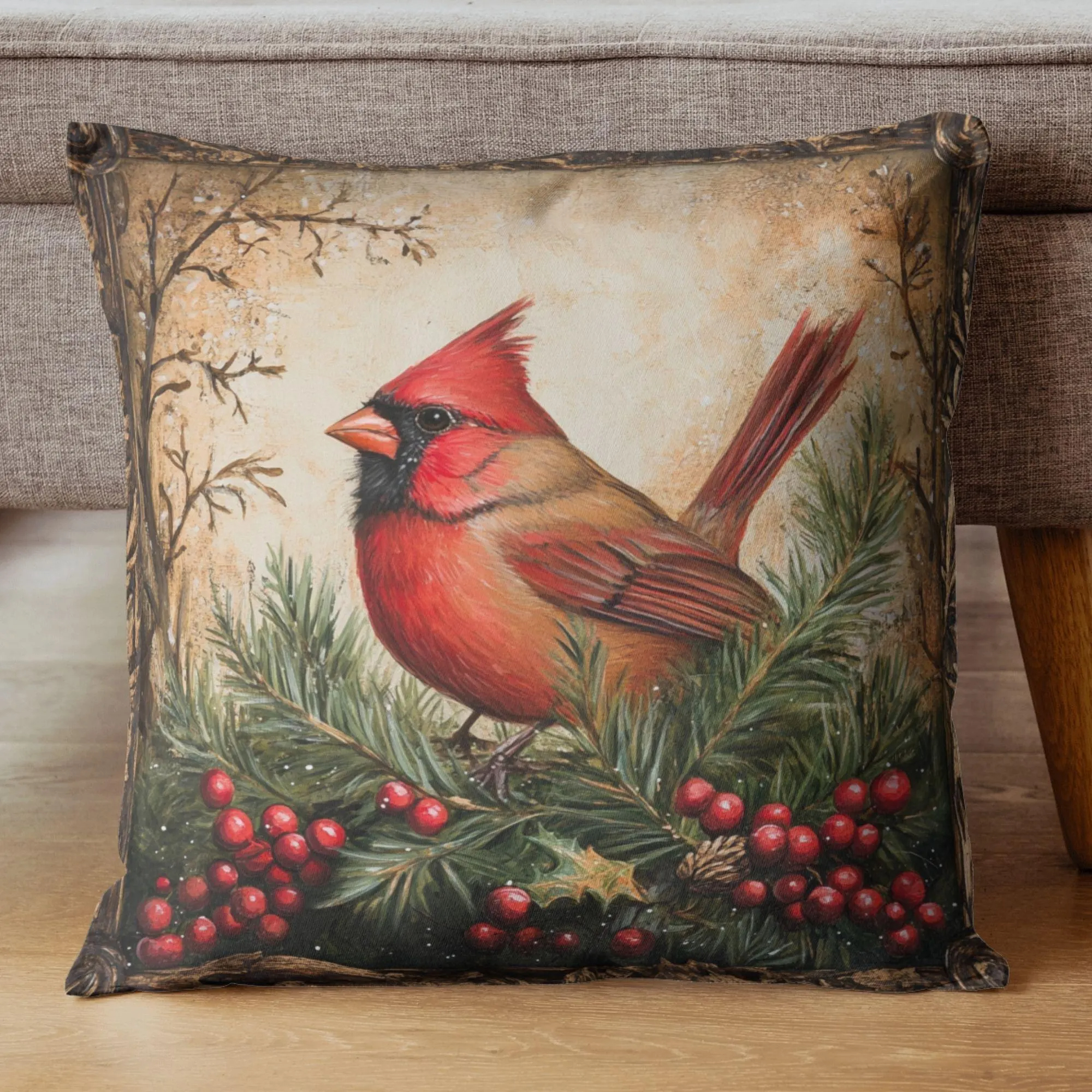 This striking pillow features a vivid red cardinal perched among evergreen branches, bright winter berries, and natural woodland details. The artwork feels warm and nostalgic, capturing the quiet beauty of a winter garden with a softly vintage, painterly touch.
